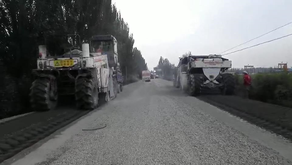 2017年8月,我公司一台RZ2300B在山西大同与维特根WR2500同场竟技。该路段为G208国道大同北段,参与施工的RZ2300B冷再生机是我公司生产的经济型机械传动冷再生机,功率为600马力,双桥驱动。该型冷再生机虽然为经济型机械传动冷再生机,与四轮升降机械传动冷再生机相比,实际工作效率却一点也不差。该路段施工的初始500米,其强度近似水泥路面,如果是一般的液压传动冷再生机将会完全干不动,但我们的RZ2300B经受住了考验,一分钟只能跑两米,对于机械传动600马力的冷再生机,这真是艰苦的工程。后续的8公里路基强度是标准强度,机器的施工轻松了许多,后期加入的一台维特根WR2500与我们的RZ2300B并肩施工,两机器均能跑到7米左右。